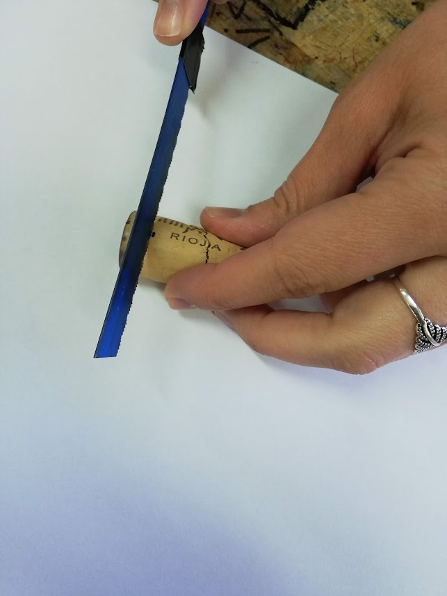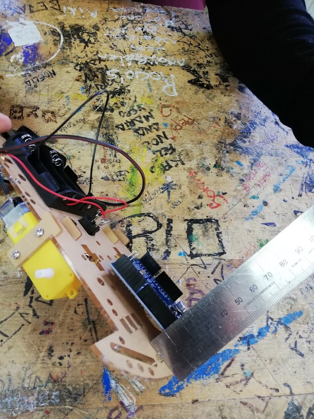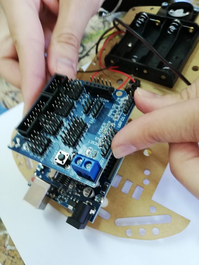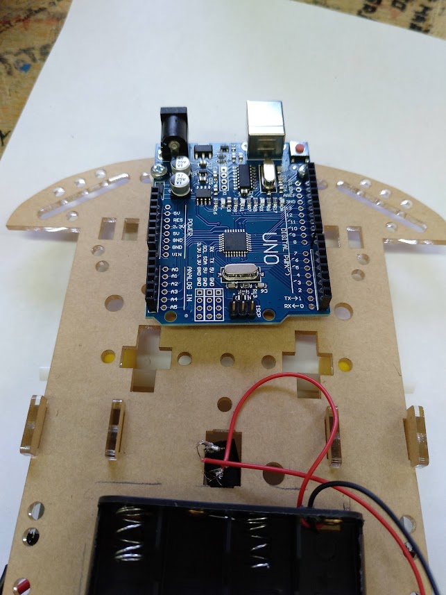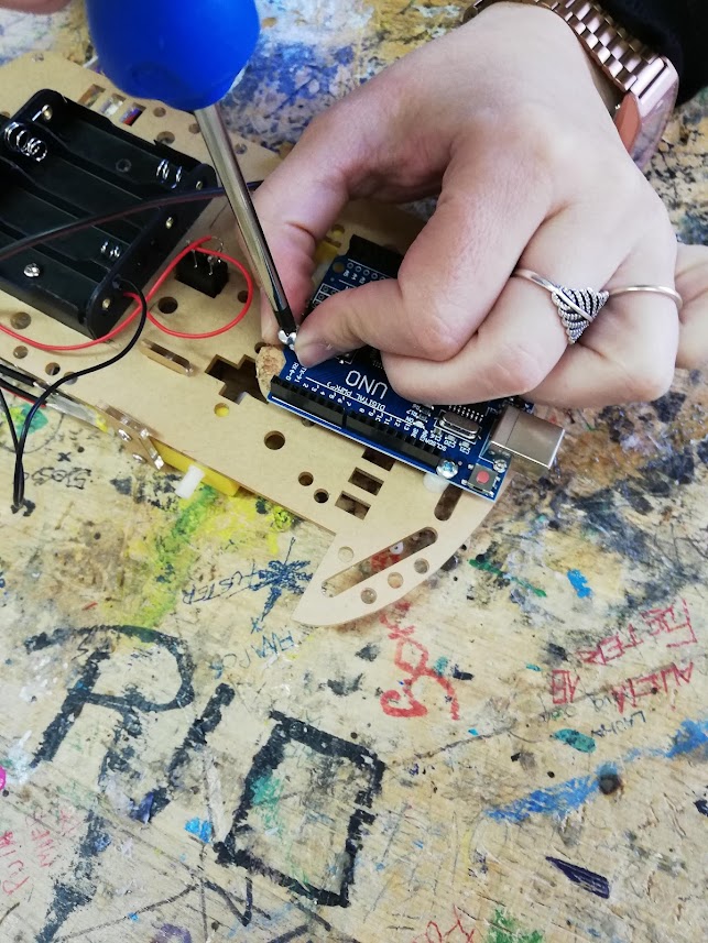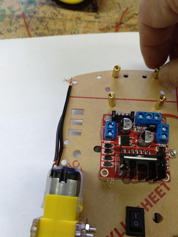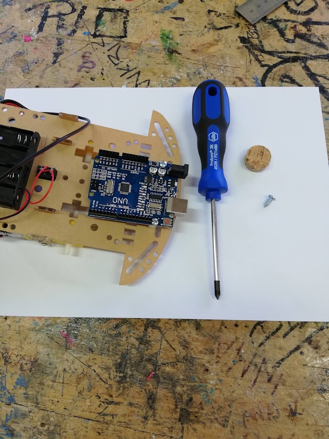 Medís la distancia entre el chasis y la parte final de la placa Arduino (aproximadamente un centímetro), para cortar con una sierra un trozo de corcho (por ejemplo) y con un tornillo rosca (pedirlo al profesor) ajustarlo en esa parte para que si presionamos al colocar componentes no se parta la placa, como se observa en las fotos:
