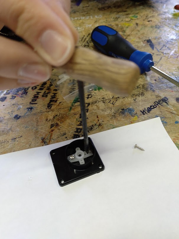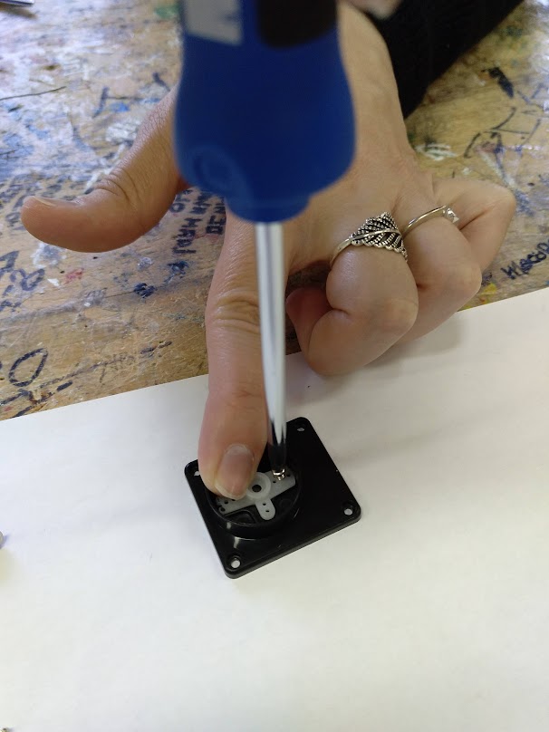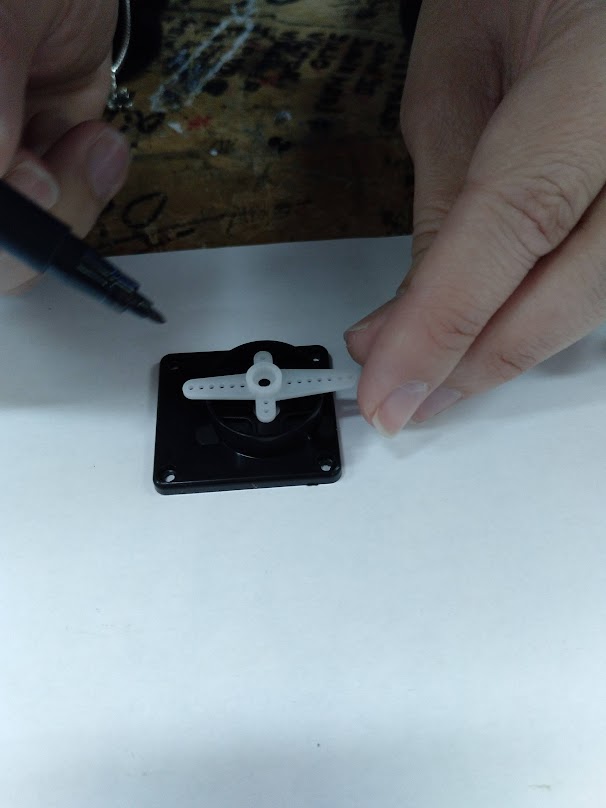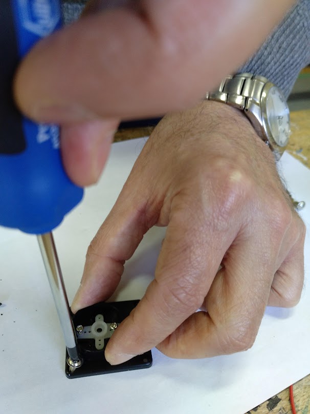Antes de fijarlo debemos poner el servomotor y ver si es capaz de girar 180 º, y podemos incluso fijarlo por debajo con un tornillo, como se ve en las fotos siguientes: