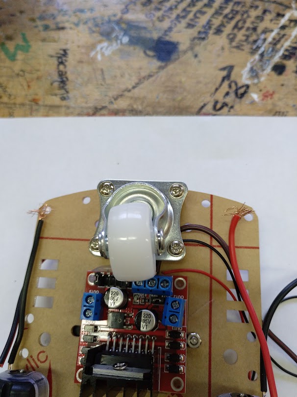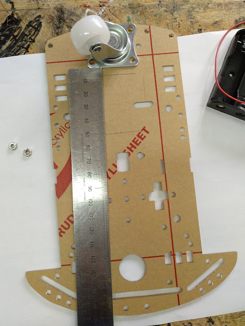 Ahora ponemos la rueda loca sobre los taladros a los que va ir unida y marcamos con un lápiz a 7 mm, de esta, cogemos el controlador de motores y marcamos con un lápiz los límites aproximados donde va a ir colocado, como se ve en la siguiente foto:
