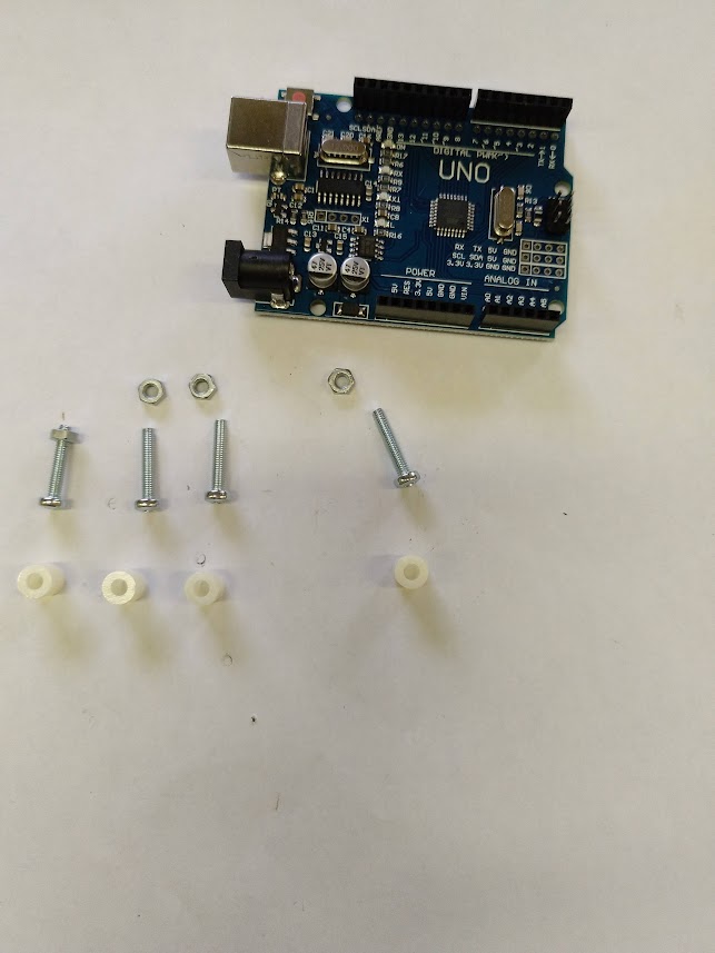 Ahora cogemos la placa Arduino, 4 casquillos de 8 mm. y 2 tornillos de M3 x 16 mm con sus tuercas(estas dos últimas cosas pideselas al profesor), como los que se ven en la foto (pero solo dos, no cuatro como aparecen en la foto):