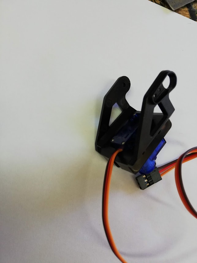 Pasamos ahora a colocar los laterales del soporte del servomotor (aquí se ve suelto, pero lo tenemos que tener ya fijado al soporte que esta unido al chasis).