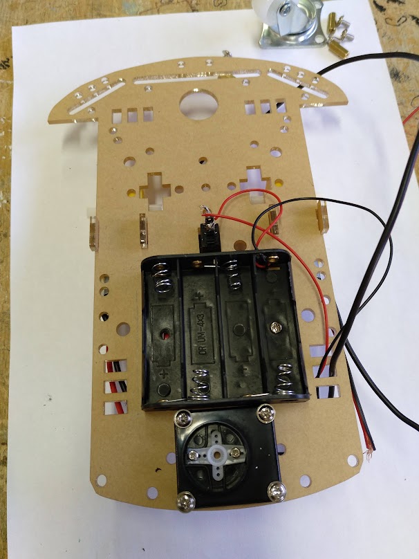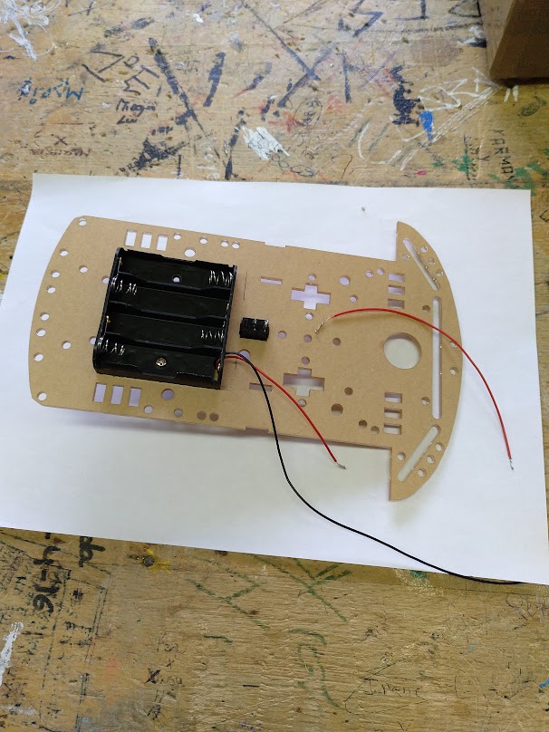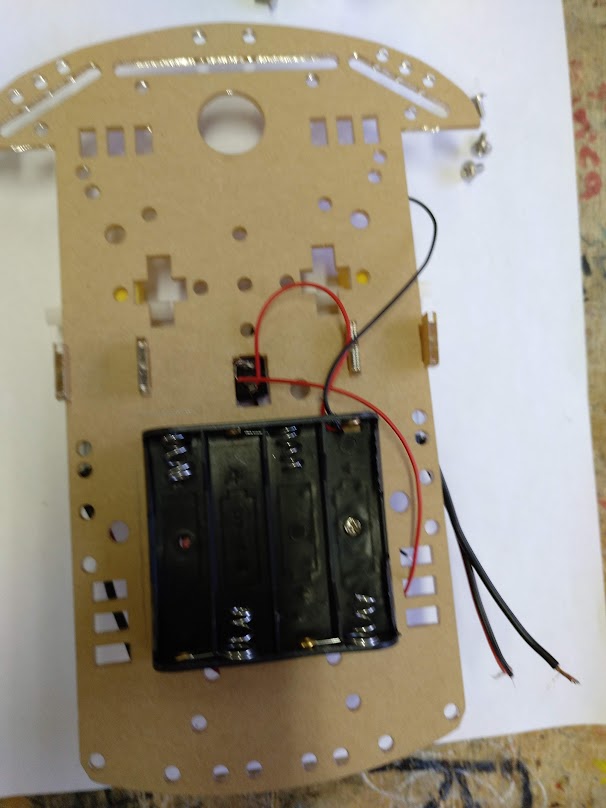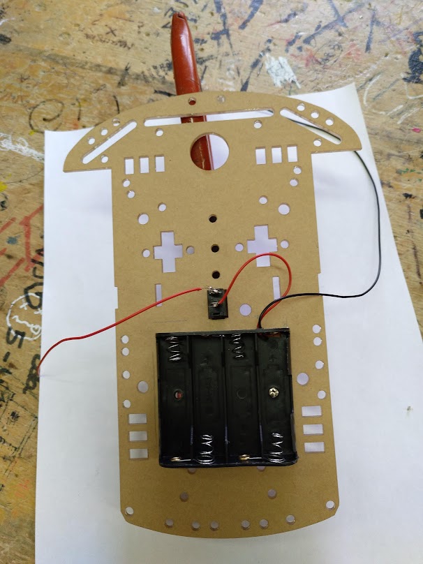 Ahora pasamos el cable negro del portapilas, junto con otro cable negro largo (tiene que llegar al otro extremo del chasis para conectarse a a la placa arduino), tal como se ven en la foto: