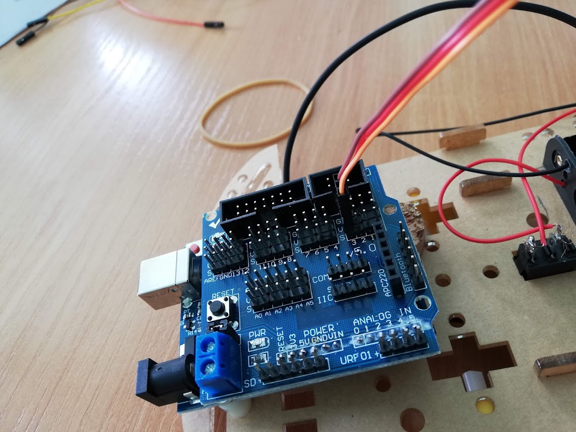 El conexionado del servo va a la fila 3 del sensor shield, tal como se ve en la foto: