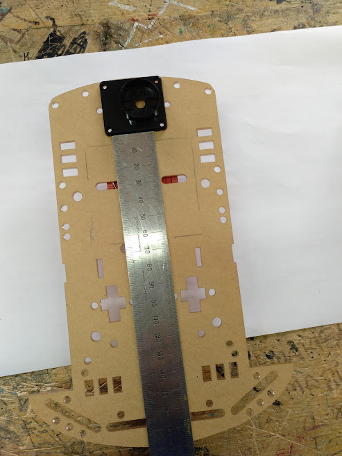 Le damos la vuelta al chasis, cogemos el soporte del servomotor y lo encaramos como se ven en la foto sobre sus taladros, y medimos 5 mm, y marcamos con el soporte de las pilas de manera aproximada, como se ve en la foto: